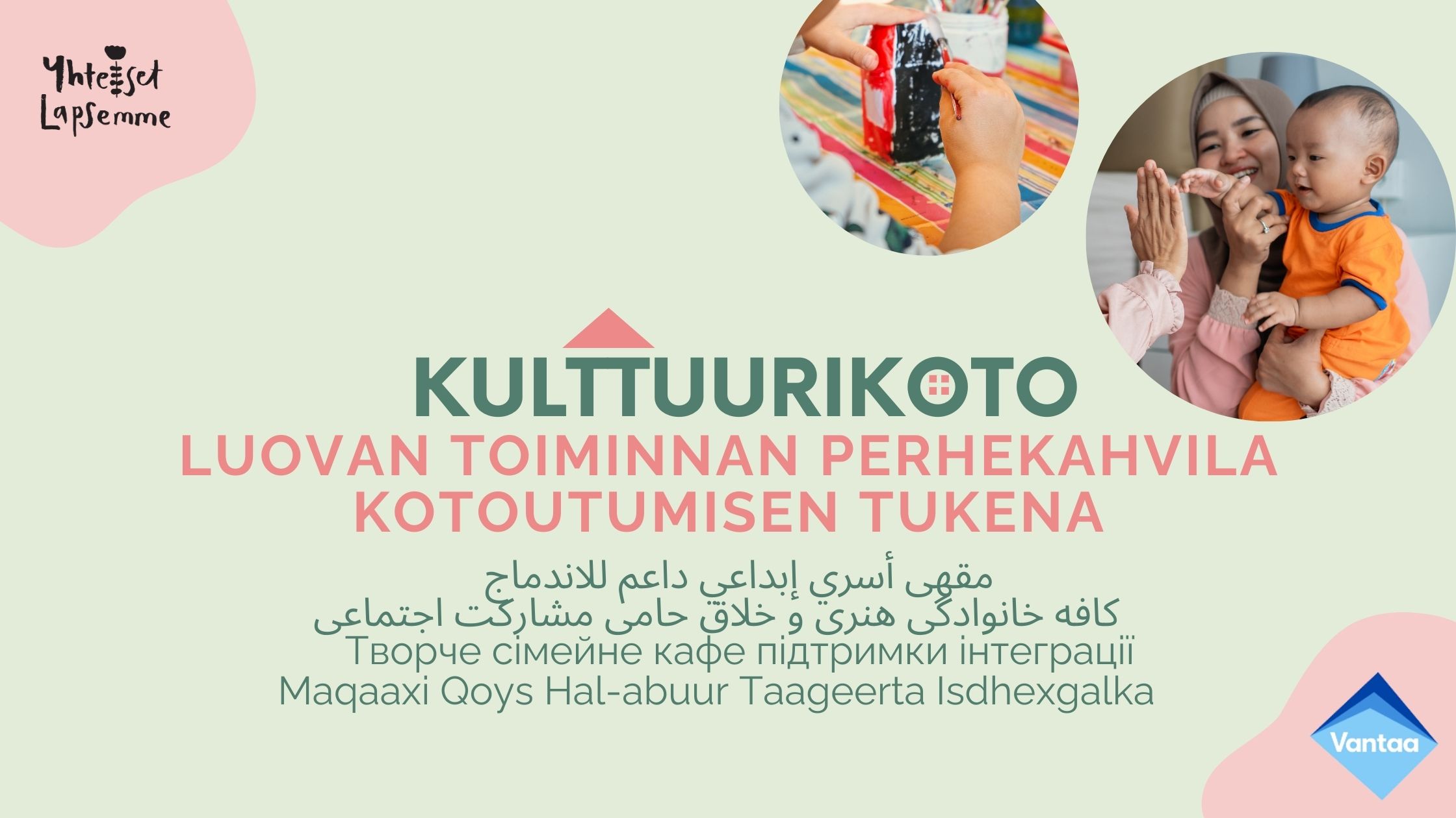 Kulttuurikoto-toiminta tarjoaa maahan muuttaneille lapsiperheille kulttuuripainotteisia perhekahviloita ja monikielisiä perhepäiviä Vantaan Lastenkulttuurikeskuksissa. Toiminta vahvistaa lasten ja vanhempien kulttuurihyvinvointia, arjen kotoutumista, kielen oppimista, sosiaalisia verkostoja ja osallisuutta, tukee yhteisöihin kiinnittymistä ja arkea sekä edistää kaksisuuntaista kotoutumista alueilla.